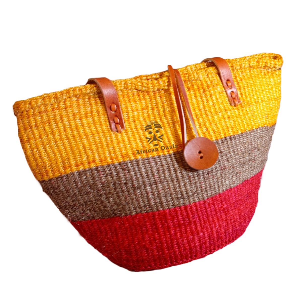 Crafted from durable natural sisal fibers, the kiondo bag is designed to be both strong and lightweight, making it ideal for daily use. The intricate weaving showcases a striking blend of yellow, brown, and red tones—colors that reflect warmth, energy, and the richness of African culture. Each pattern is uniquely handcrafted, ensuring that no two bags are exactly alike, giving you a truly one-of-a-kind accessory.