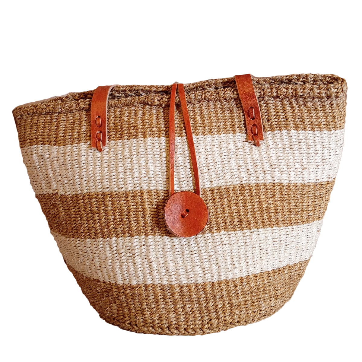 This elegant handwoven striped kiondo basket bag is crafted from durable natural sisal fibers and finished with strong leather handles and a secure leather tie closure. Its neutral brown and cream stripes create a timeless African style, making it perfect for shopping, beach outings, travel, or everyday use while supporting traditional artisan craftsmanship.